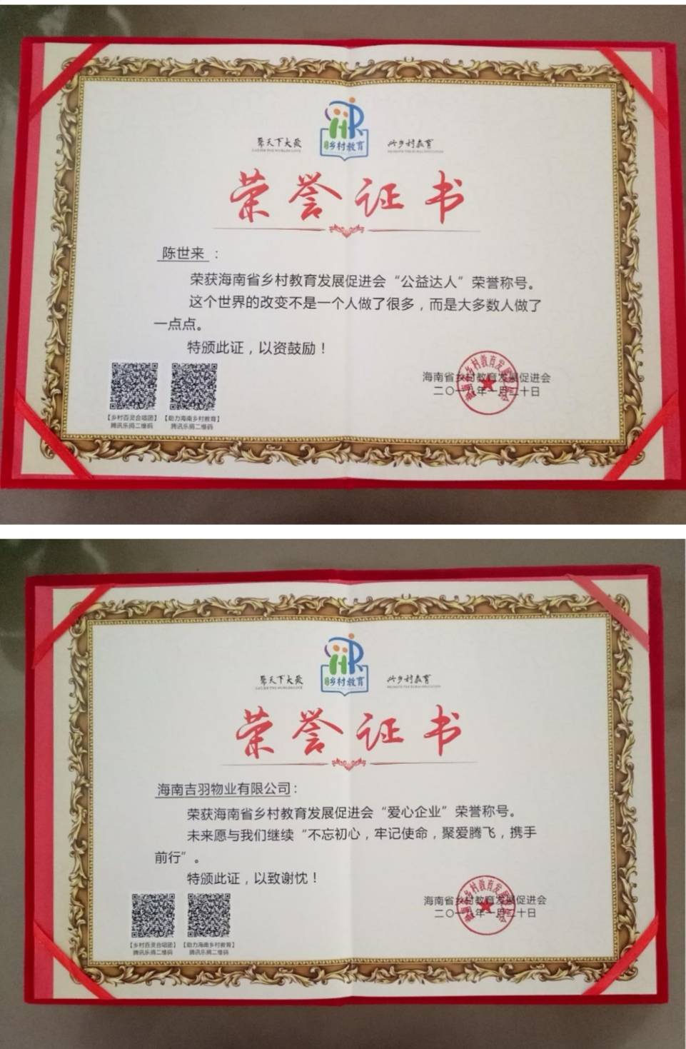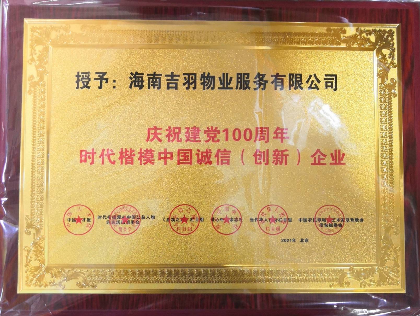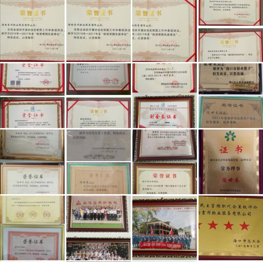 董事长陈世来多年来诚信经营,重合同守信,安排工人就业,带领员工帮扶老人,积极参与各种公益党风活动,捐款捐物,奉献爱心等方面贡献突出,海南吉羽物业有限公司被授予:“庆祝建党100周年时代楷模中国诚信(创新)企业”,公司董事长陈世来被授予:“庆祝建党100周年时代楷模爱心中国诚信企业家”光荣称号。