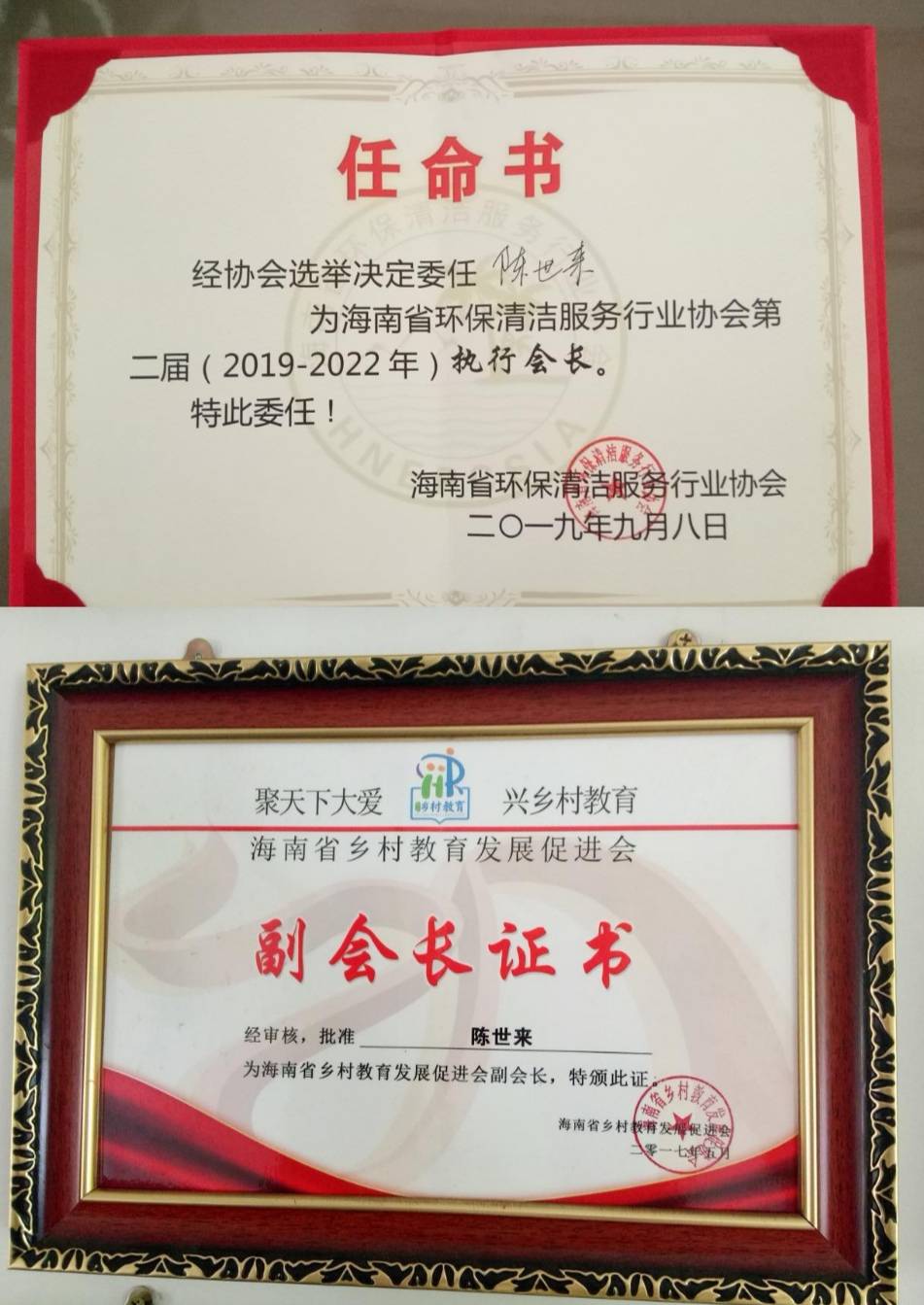 公司董事长陈世来,今年53岁,毕业于西安电子科技大学。现任中国人民解放军海南陆军预备役步兵师中校助理工程师、陈念文化研究会会长,海南省工商联执委、海口市工商联执委、海口市琼山区工商联副主席、海南省乡村教育促进会副会长、海南省环保清洁服务行业协会执行会长、海南省家庭行业协会副会长、海口市家庭行业协会副会长、海口市光彩事业促进会常务理事、海口市企业家协会监事会副主席、海南省建筑节能协会常务理事。