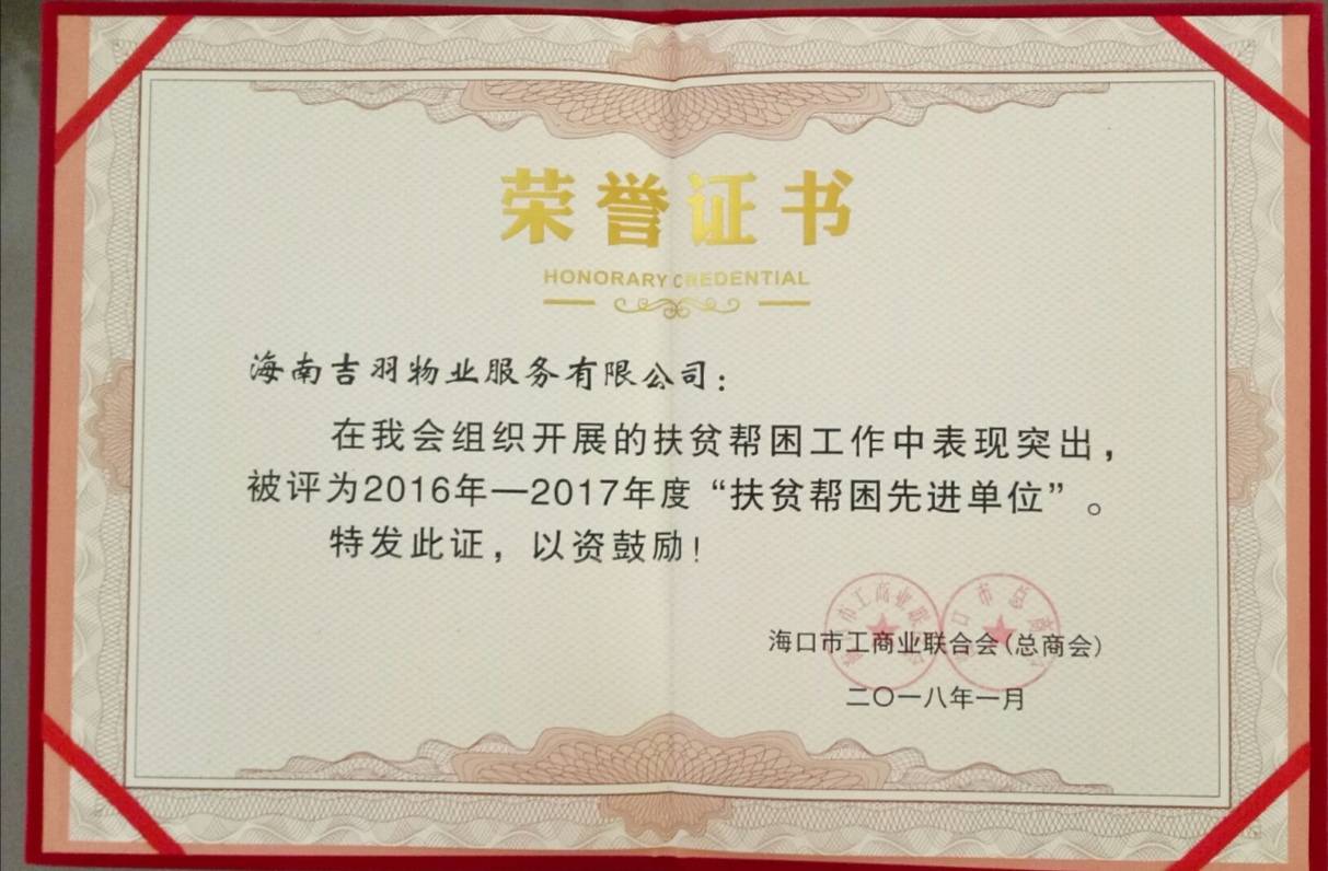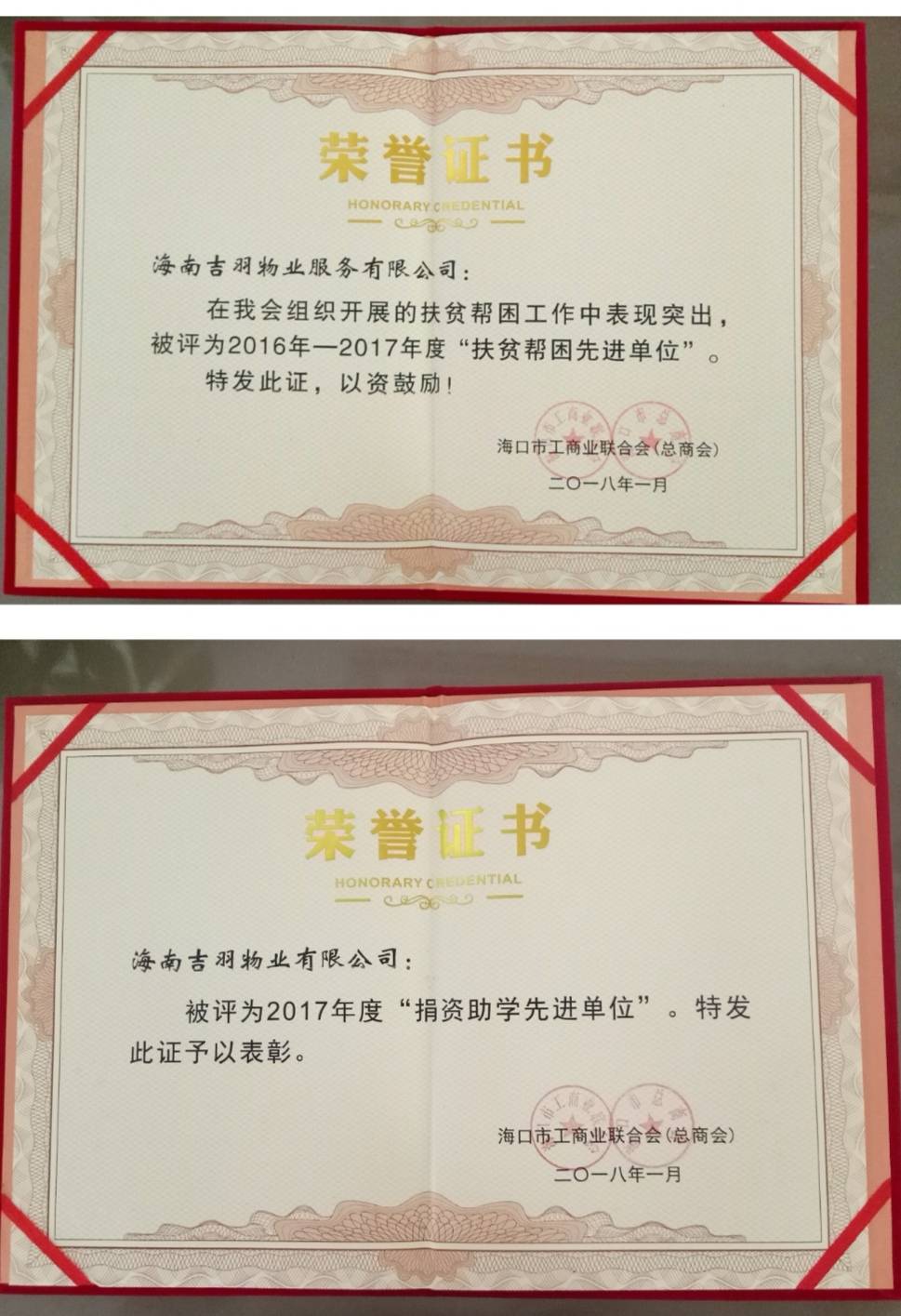 海南吉羽物业有限公司2009年被海南省发改委、工信厅评为“海南省优秀民营企业”;2010年被评为“海口市第二次经济普查先进集体”;2011年被海南省企业管理协会评为“理事单位”;2012年发展家庭服务业促进就业部际联席会议办公室评为“全国千户企业”;2012年被中共海南省非公组织工委评为“先进基层党组织”;2013年被海南省人力资源和社会保障厅评为“海南省高校毕业生就业见习基地”;2014年被海口市委组织部列为“非公党组织示范点”;获得国家人力资源与社会保障部批准使用“中国家庭服务”标识牌;2015年成立中国人民解放军海南陆军预备役步兵师通信营有线电连;2015年12月被中国人民解放军海南陆军预备役步兵师评为“全面建设先进单位”;