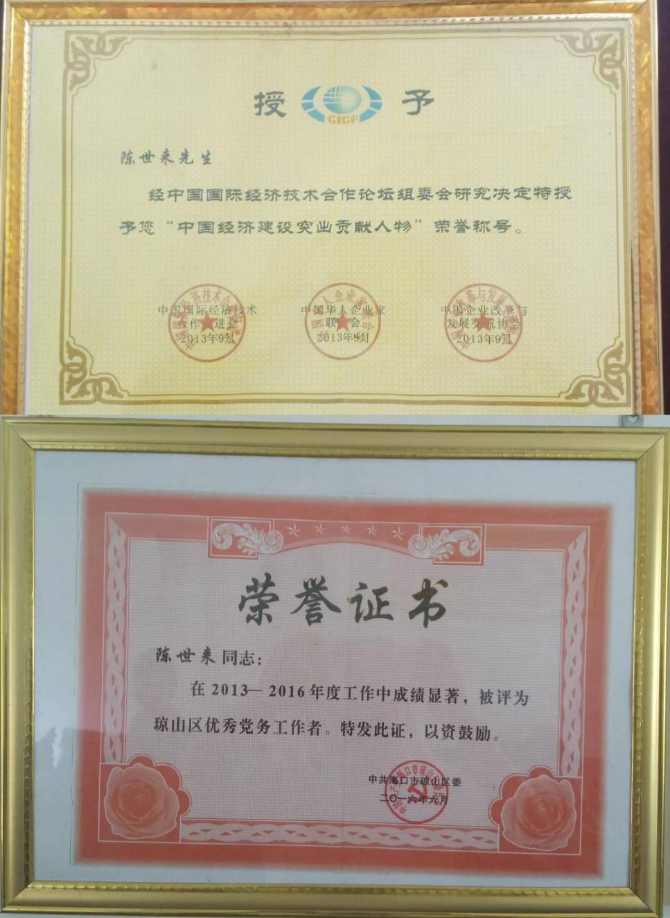 2008年12月被海口市人事劳动保障局评为“海口市创业能手”;2011年6月被海南省非公有制经济组织工作委员会评为“优秀共产党员”;2011年7月被中共海口市琼山区委评为“优秀共产党员”;2013年9月被中国国际经济技术合作促进会、中国华人企业家联合会及中国企业改革与发展交流协会评为“中国经济建设突出贡献人物”;2015年7月被海南省非公有制经济组织工作委员会评为“优秀党务工作者”;2015年12月被中国人民解放军海南陆军预备役步兵师司令部评为“优秀预备役军官”;2016年6月获得海口市琼山区“优秀党务工作者”。2021年3月被海口市总工会授予“海口市优秀工会之友”荣誉称号。