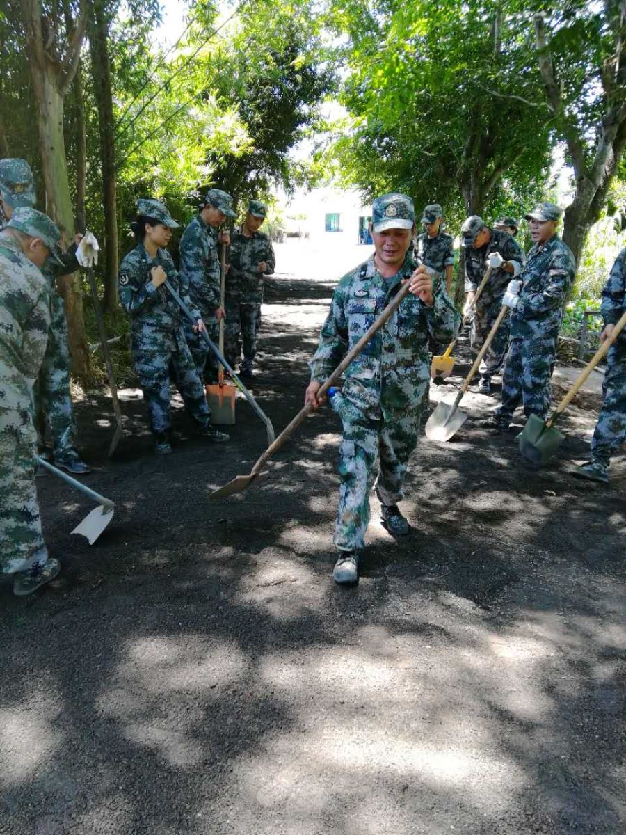 门口,准备了扫把、手套、铁锹等工具,举着"通信营应急分队"旗帜向海南金鹿工业园出发。8点30分我们到达目的地,大家分配好工作,
