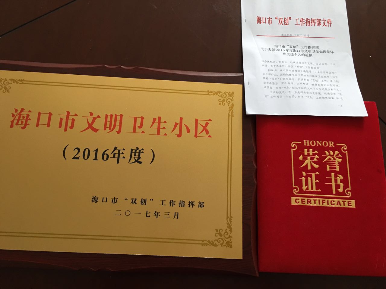 金鹿花园、怡海花园小区被海口市双创指挥部评为"海口市文明卫生小区"、"文明卫生楼厦"。