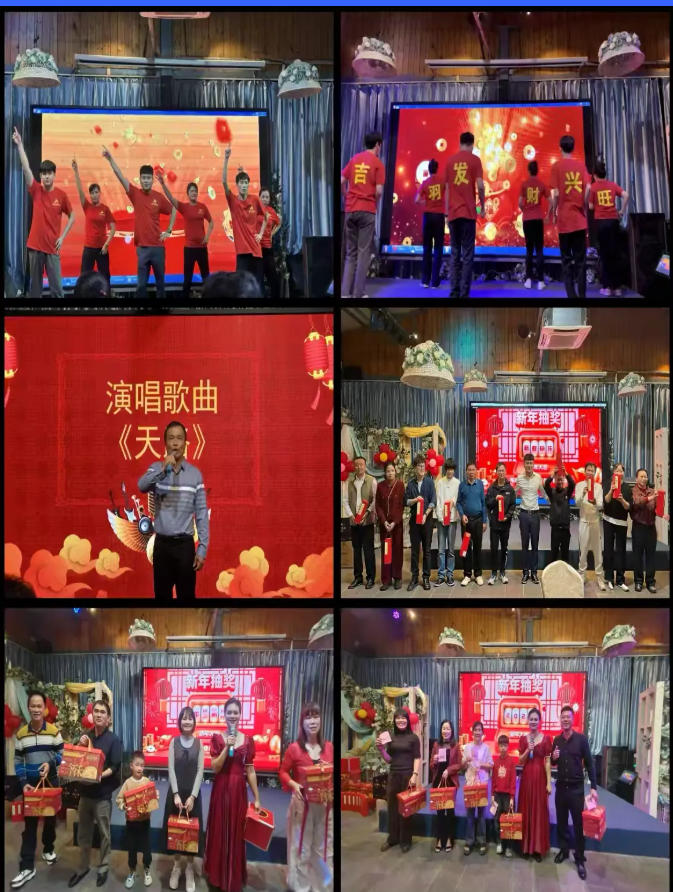财务部、项目部《抓钱舞+发财舞串烧》活力喜庆;客服部《风吹三千里》舞姿柔美;技术部《天路》歌声高亢。随后幸运奖抽奖开启,现场欢乐不断。